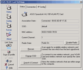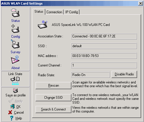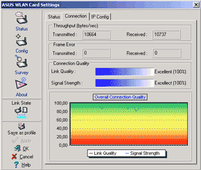 В закладке «Status» можно посмотреть параметры установленного соединения, просканировать диапазоны на наличие доступных радиосетей и подключится к ним, указав нужный SSID. В «Connection» можно узнать качество и мощность сигнала, а так же полюбоваться графиком изменения этих параметров. Именно полюбоваться, так как изменения в графике происходят каждую секунду, а по оси × умещается всего несколько минут значений, поэтому увидеть график долговременных изменений сигнала тут не получится. Правда долговременные и разнообразные графики может строить утилита «Site Monitor», идущая в комплекте.