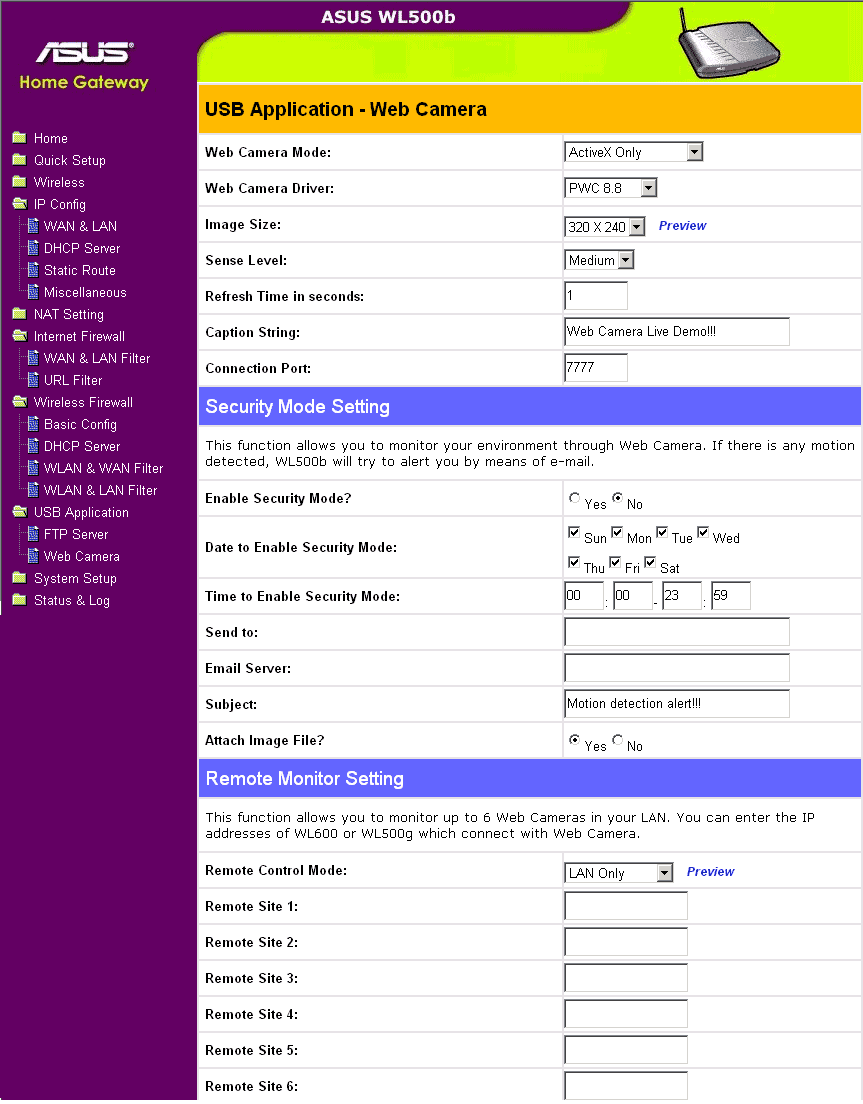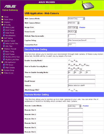Вторая интересная (хотя и не всем нужная) возможность подключение WEB камеры. В этом случае, зайдя по HTTP на заданный порт, можно увидеть, что происходит в помещении с маршрутизатором. Кроме того, WL-500b позволяет мониторить помещение и в случае детектирования движения, отсылать фотографии на заданный email-адрес. Так же есть возможность удаленного мониторинга до 6 удаленных WEB-камер в локальной сети.