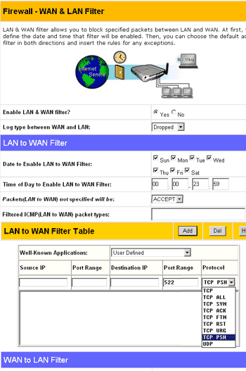 В разделе «LAN & WAN Firewall» производится настройка файрвола между LAN и WAN интерфейсами. Раздел делится на две одинаковые части фильтр пакетов из LAN в WAN и фильтр из WAN в LAN.