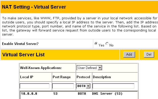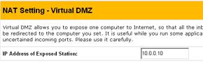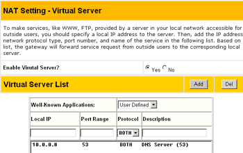 В следующих двух закладках определяются виртуальные сервера (редирект TCP/UDP портов внутрь локальной сети) и DMZ хост.