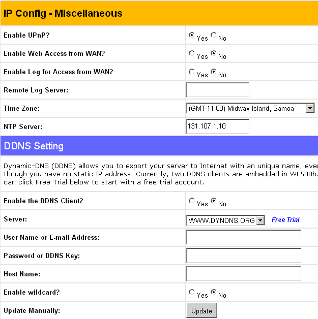 В «Miscellaneous» секции сетевых настроек доступны дополнительные опции, такие как разрешение доступа к WEB интерфейсу и логам из Интернет, задание IP адреса лог-сервера, указание time-зоны и адреса NTP-сервера, а так же активация новомодного стандарта от MS UPnP (настройка устройства налету, посредством операционной системы WinXP).