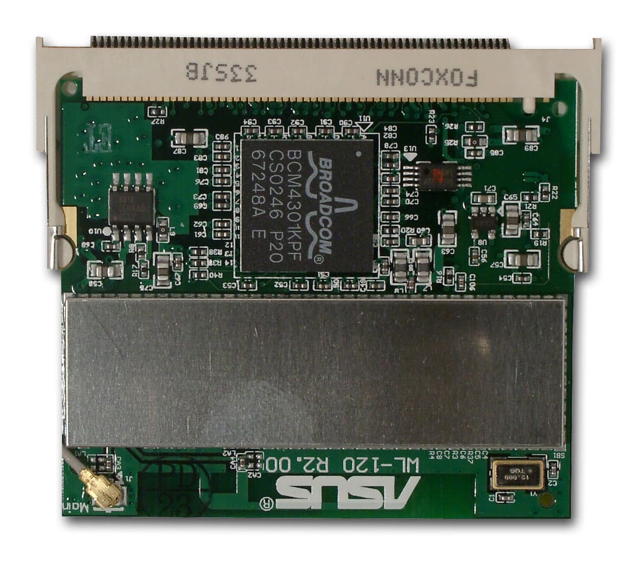 Беспроводная часть WL-500b вынесена в отдельный модуль. Микросхема BCM4301KPF включает в себя 802.11b MAC/baseband контроллеры, поддержку WEP шифрования, а так же интерфейсы к другим контроллерам. Остальная начинка беспроводного модуля скрыта под экраном.