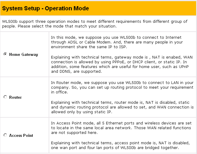 В разделе «System Setup» можно выбрать один из трех режимов функционирования маршрутизатора. Доступны режимы маршрутизатора с поддержкой NAT (стандартный режим), роутер (NAT отсутствует, зато доступен динамический роутинг) и точка доступа, в котором так же отсутствует NAT, а все пять портов устройства работают в режиме моста.