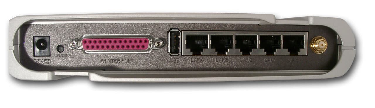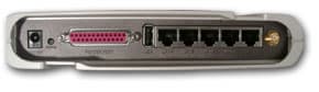 В задней части корпуса расположены power-коннектор, кнопка сброса настроек, параллельный порт для подключения принтера (да, да, маршрутизатор еще является и принт-сервером), порт USB (для подключения принтера, flash-диска или web-камеры), 5 ethernet коннекторов (4 LAN и 1 WAN), а также разъем для подключения антенны. Поставляемая с устройством антенна является съемной, на ее место можно подключить более мощную антенну с усилителем. Хочу отметить, что в текущей прошивке устройства нельзя посмотреть статус USB-принтера. Для его подключения нужно использовать утилиту «Printer Setup Wizard», поставляемую на компакт диске в комплекте устройства.
