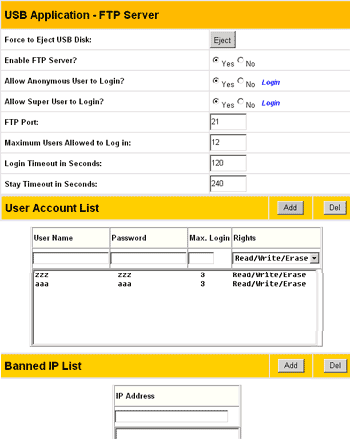 Переходим к сладкому «advanced» возможности. К WL-500b можно подключить USB 1.1 диск и получить к нему доступ через FTP. Другими словами, маршрутизатор может работать и в качестве FTP сервера. Можно задать список пользователей и назначить им разные права. А так же указать список забаненных IP адресов, которым будет запрещен доступ к FTP серверу.