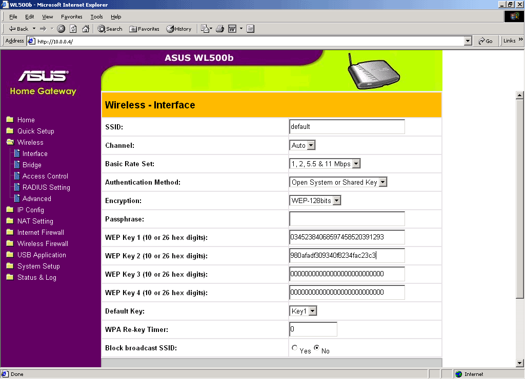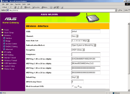 Все настройки сгруппированы по группам, в виде структуры директорий. В разделе «Wireless Interface» задаются стандартные настройки беспроводного интерфейса, как то SSID, номер канала и его скорость, тип аутентификации (в том числе посредством Radius через 802.1x), а так же тип шифрования и ключи. Из особенностей стоит отметить наличие функции «автоматической ротации четырех ключей» через заданный промежуток времени.