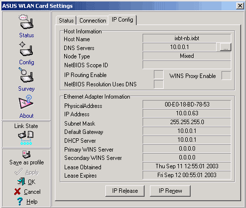 Можно увидеть текущие значения IP-настроек беспроводной сети и обновить их с DHCP сервера. Интересно то, что программа не позволяет вручную задать нужные значения.