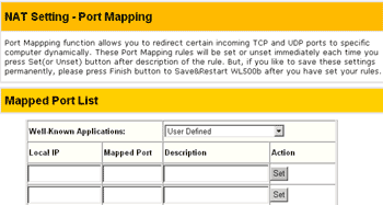Далее идет секция настроек NAT. Я не совсем понял, за что отвечают настройки в закладке «Port Mapping». Возможно, они все же отвечают за работоспособность динамических протоколов (таких как NetMeeting), но в описании об этом сказано както туманно.
