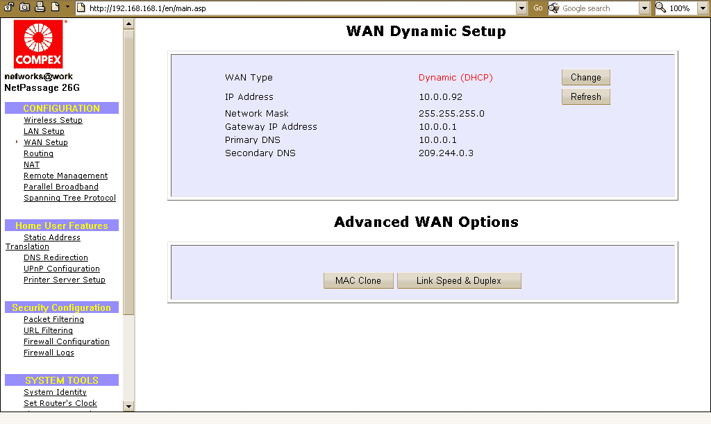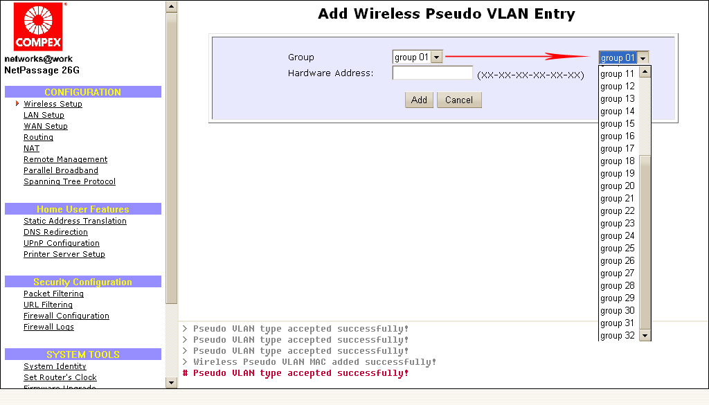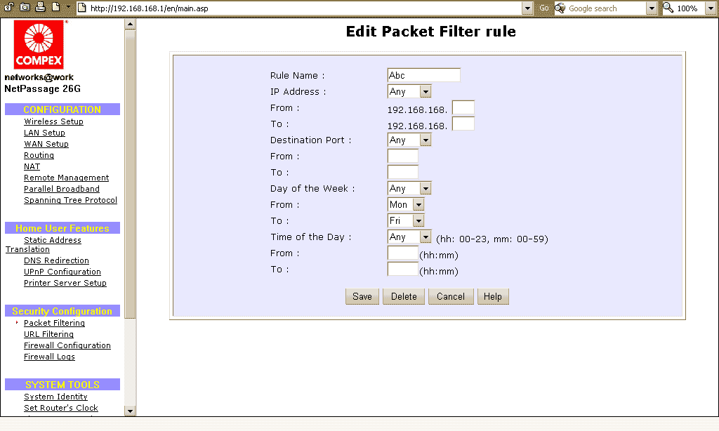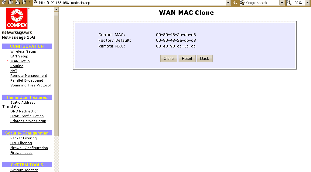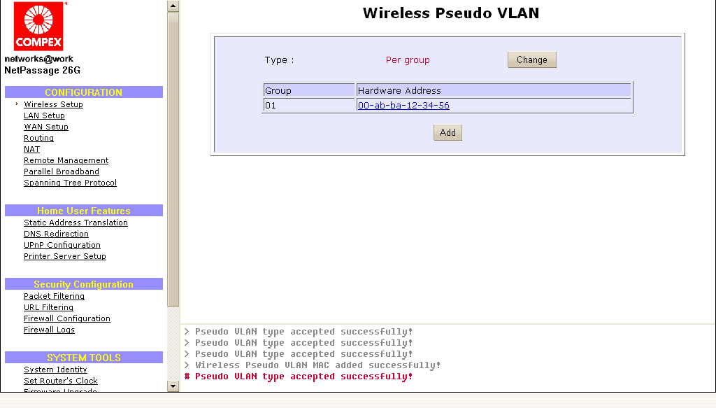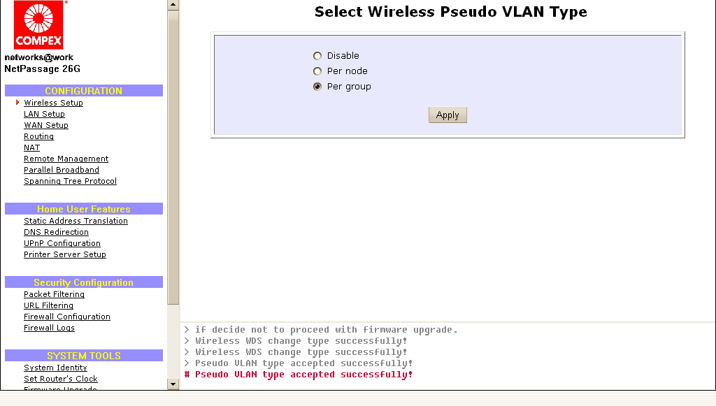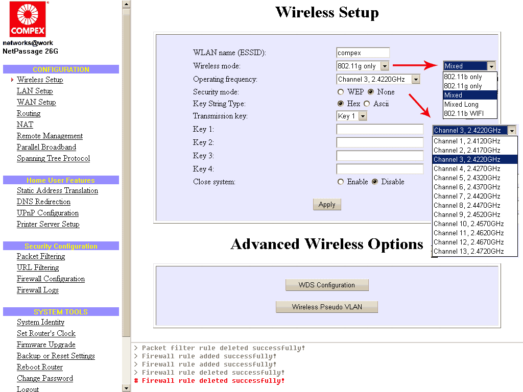 Из особенностей конфигурации хочется отметить невозможность прямого задания MAC-адреса на WAN интерфейсе, включение/выключение автоопределения полярности на портах на WAN интерфейсе (выключение автоопределения бывает полезно, когда устройства не могут найти друг друга), возможность выбора скорости соединения на WAN интерфейсе (ограничена всего двумя режимами: 100 Мбит/с полный дуплекс или 10 Мбит/с полудуплекс; возможность выбрать 10 Мбит/с с полным дуплексом отсутствует), а также присутствие дополнительных режимов беспроводной связи (Mixed, Mixed Long, .11b WIFI), о которых ничего не сказано в документации. Осмелюсь предположить, что Mixed режим — как другое название .11b+g режима. Файрвол позволяет задавать гибкие правила фильтрации и вести подробный log-журнал, но возможность использования для этого внешнего log-сервера отсутствует. Протоколирование по отдельным правилам не предусмотрено. Также присутствует возможность фильтрации пакетов на LAN — интерфейсе и фильтрация по URL. Добавлена возможность создания Wireless Pseudo VLAN (беспроводная псевдо-виртуальная сеть), которая позволяет скрыть компьютеры беспроводного сегмента друг от друга (разделение по узлам) или объединить их в изолированные группы (разделение по группам, до 32 групп).