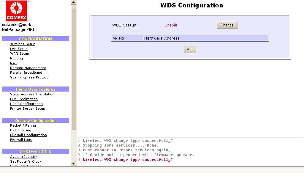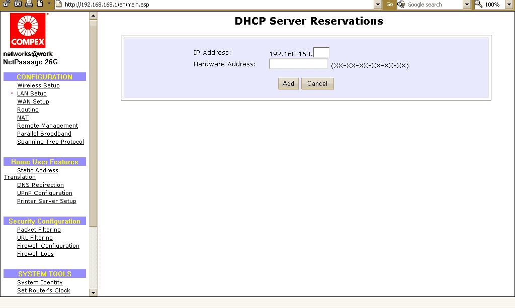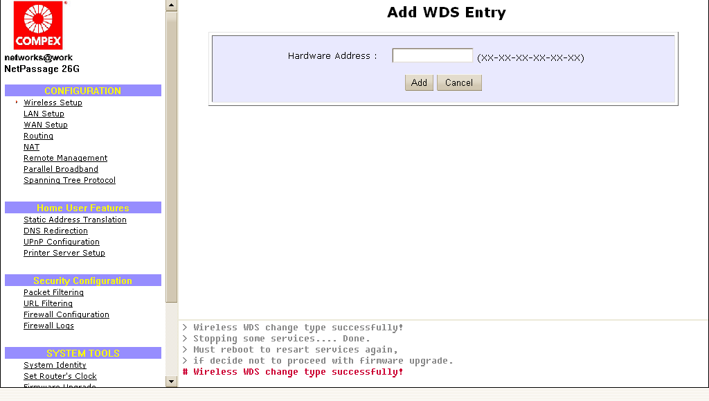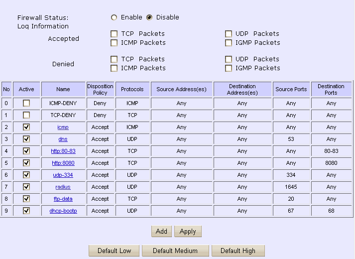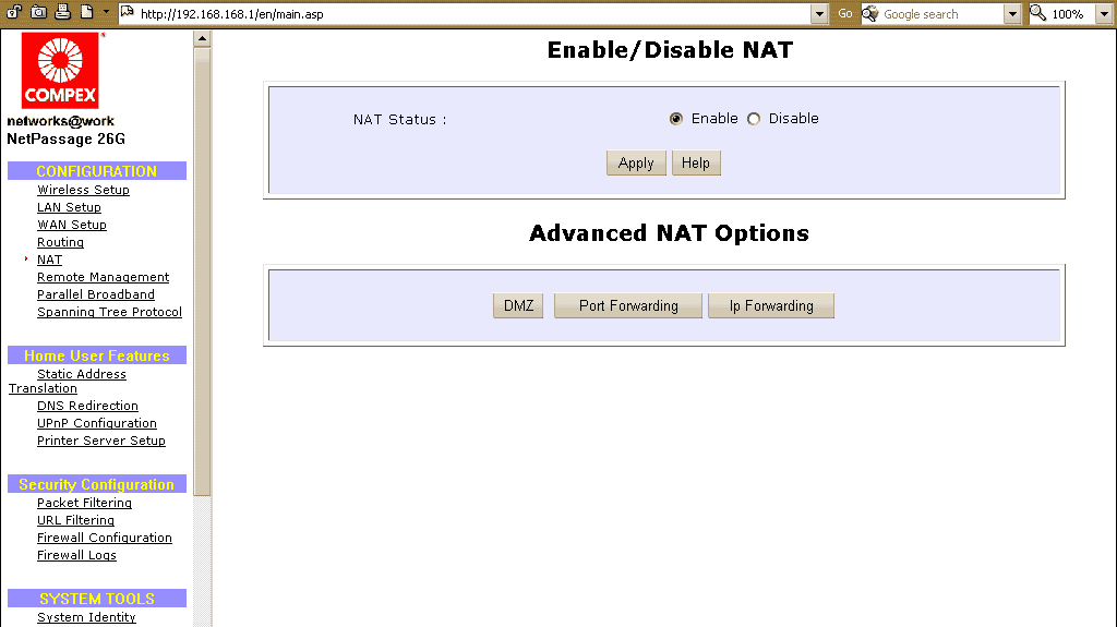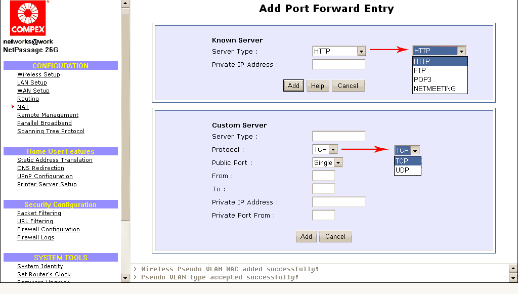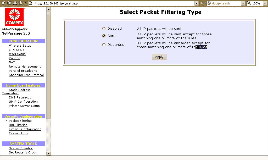 Из особенностей конфигурации хочется отметить невозможность прямого задания MAC-адреса на WAN интерфейсе, включение/выключение автоопределения полярности на портах на WAN интерфейсе (выключение автоопределения бывает полезно, когда устройства не могут найти друг друга), возможность выбора скорости соединения на WAN интерфейсе (ограничена всего двумя режимами: 100 Мбит/с полный дуплекс или 10 Мбит/с полудуплекс; возможность выбрать 10 Мбит/с с полным дуплексом отсутствует), а также присутствие дополнительных режимов беспроводной связи (Mixed, Mixed Long, .11b WIFI), о которых ничего не сказано в документации. Осмелюсь предположить, что Mixed режим — как другое название .11b+g режима. Файрвол позволяет задавать гибкие правила фильтрации и вести подробный log-журнал, но возможность использования для этого внешнего log-сервера отсутствует. Протоколирование по отдельным правилам не предусмотрено. Также присутствует возможность фильтрации пакетов на LAN — интерфейсе и фильтрация по URL. Добавлена возможность создания Wireless Pseudo VLAN (беспроводная псевдо-виртуальная сеть), которая позволяет скрыть компьютеры беспроводного сегмента друг от друга (разделение по узлам) или объединить их в изолированные группы (разделение по группам, до 32 групп).
