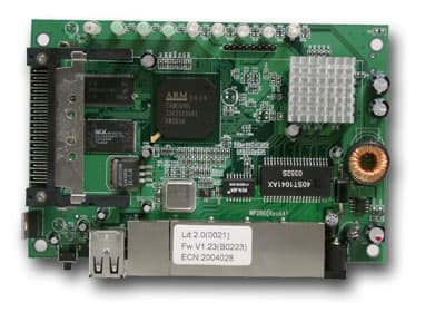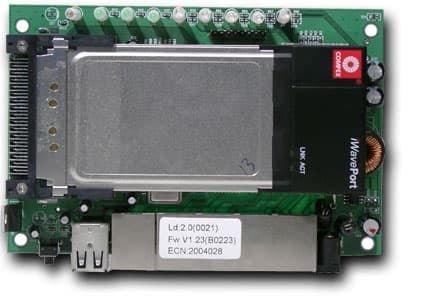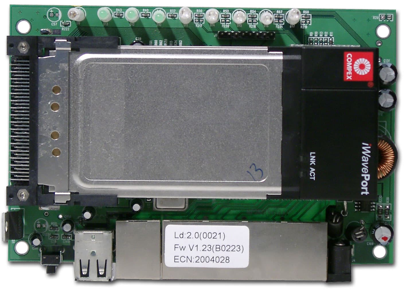 После открытия устройства привлекает внимание беспроводная PCMCIA — карточка Compex iWavePort WL54G, вставленная в соответствующий разъем на плате, которая и отвечает за работу беспроводной части нашего роутера.