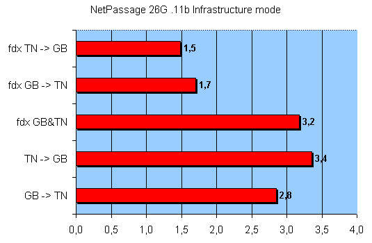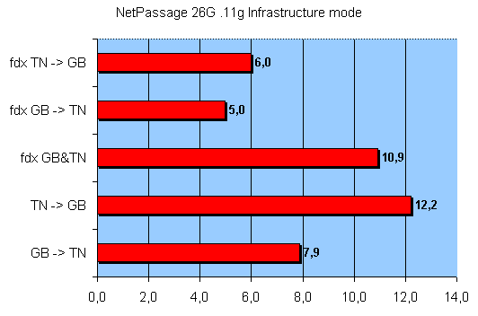 Тест WLAN — WLAN — две карточки, режим Infrastructure: трафик гонялся между сетевыми карточками с использованием точки доступа. Для тестирования использовалась беспроводная сетевая карта Gigabyte 802.11g PCI WLAN Card и TrendNET TEW-401PCplus PC Card. Скорость выставлялась в режим Auto для 11g и 11b режимов. Тест производился с помощью Chariot NetIQ. Расстояние между точками не превышало пяти метров.