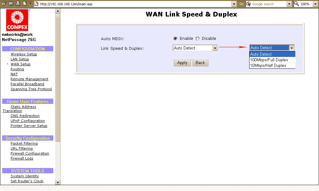 - Возможность задания скорости и режима дуплекса на WAN интерфейсе, но выбор ограничен двумя вариантами