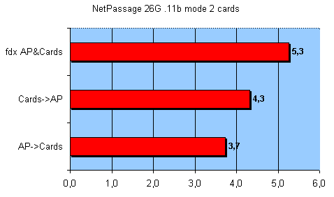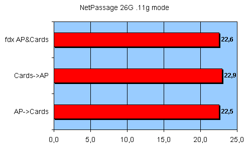 Тест LAN — WLAN две карточки — тест точки доступа: трафик гонялся между компьютером в LAN-сегменте и двумя беспроводными адаптерами в режиме Infrastructure (сначала обе карточки гнали трафик в одну сторону, потом обе в другую, а потом обе в обе стороны). Скорость соединения выставлялась в режим Auto для 802.11g и 802.11b. Для тестирования использовалась беспроводная сетевая карта Gigabyte 802.11g PCI WLAN Card и TrendNET TEW-401PCplus PC Card. Тест производился с помощью Chariot NetIQ. Расстояние между точками не превышало пяти метров.