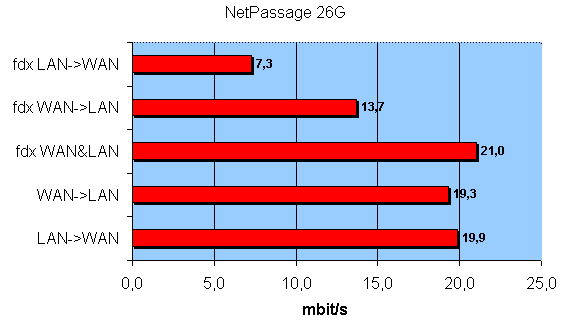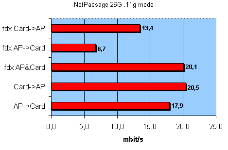 Предельная скорость: 20,5 мбит/с — обычная скорость для 11g режима (на рекорды не претендует). Распределение скоростей в полнодуплексном режиме весьма необычное: скорость от точки доступа в 2 раза ниже скорости к точке доступа (мне всегда казалось, что точка доступа должна отдавать больше чем принимать, а вообще правильнее, если скорости равны).