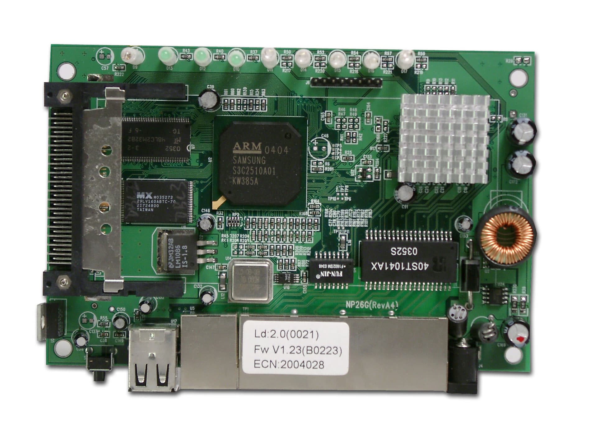 Сердце роутера — процессор Samsung S3C2510 (частота процессора: 166 МГц, 2 10/100 — Ethernet контроллера, поддержка PCI/PCMCIA — шины, поддержка шины USB), за автоопределение на портах коммутатора отвечает микросхема LB 40ST1041AX, также на плате расположены 4 Мб DRAM памяти (48LC2M32B2TG-6), работающей на частоте 166 Мгц, и 2 Мб flash-памяти (29LV160ABTC-70). Что находится под радиатором выяснить не удалось, так как он намертво приклеен к чипу.