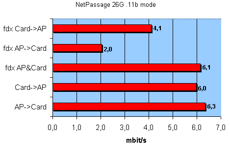 Тест LAN — WLAN одна карточка — тест точки доступа: трафик гонялся между компьютером с беспроводной сетевой картой и компьютером локального (LAN) сегмента. Скорость соединения выставлялась в режим Auto для 802.11g и 802.11b. Для тестирования использовалась беспроводная сетевая карта Gigabyte 802.11g PCI WLAN Card. Тест производился с помощью Chariot NetIQ. Расстояние между точками не превышало пяти метров.