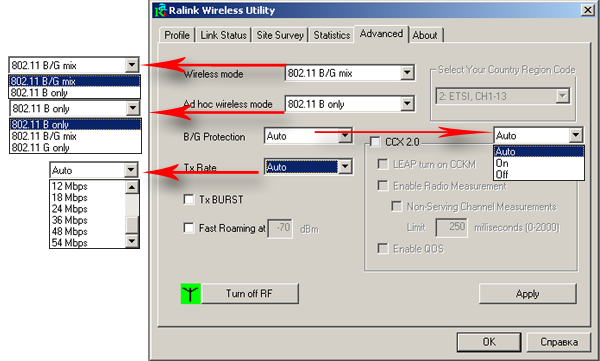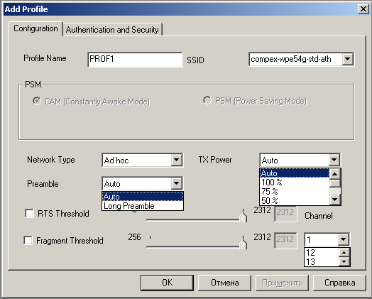 Утилита настройки поддерживает множество различных видов WPA-шифрования. Несмотря на то, что при установке был указан регион "Восточная Европа/Россия", количество каналов ограничено 11-ю.