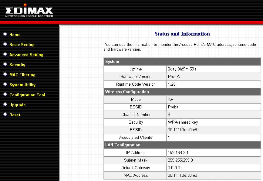 Первый пункт Home содержит информационную часть (время работы, версию оборудования, версию встроенного ПО), настройки беспроводного соединения (режим работы, сетевой идентификатор, номер канала, установленный режим безопасности, MAC-адрес, количество пользователей точки), настройки проводного подключения (IP-адрес, маска подсети, основной шлюз, MAC-адрес).При написании статьи использовалась заводская прошивка firmware ver.1.25 устройстве.