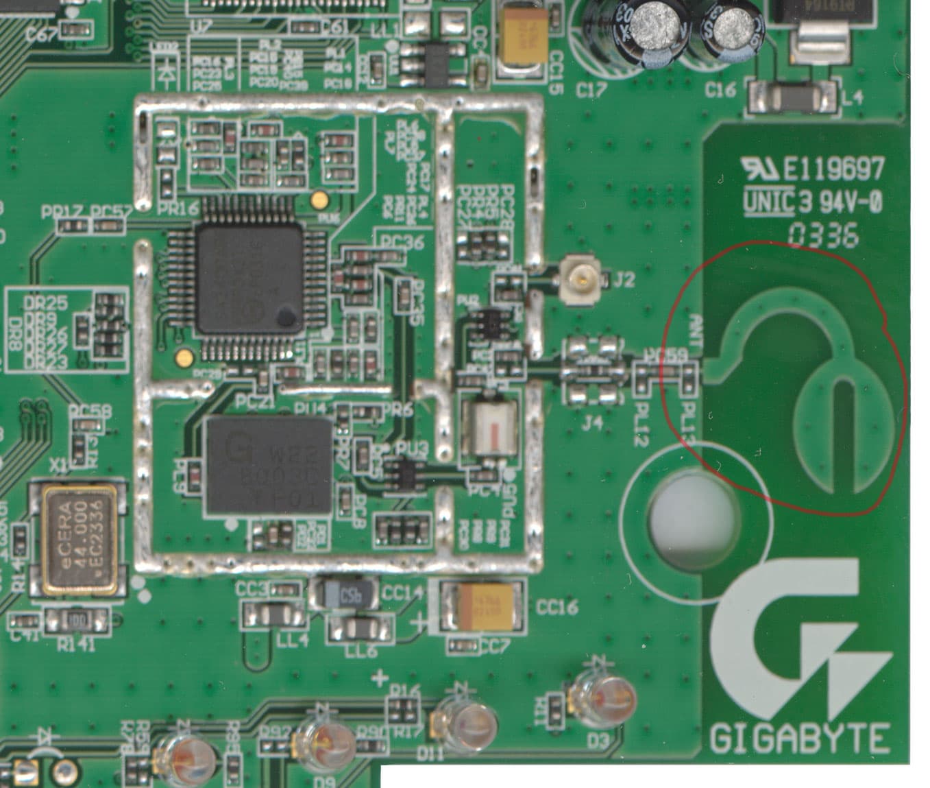 За беспроводную часть отвечают микросхемы SA2411 и W22 B003C , вместе образующие блок трансивера. Обычно его экранируют, но в данном случае мы видим отсутствие экрана, что, возможно, скажется на помехозащищенности устройства. Вторая антенна (указанная в спецификациях, как внутренняя), обведена на фотографии красным цветом.