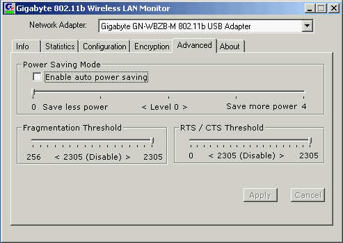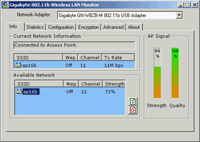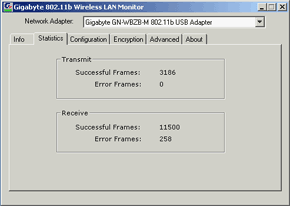 Вместе с драйверами ставится утилита Wireless LAN monitor, на примере которой и будет показано конфигурирование адаптера. В закладке Info можно просканировать диапазон на наличие доступных беспроводных сетей и подключится к одной из них. В Statistics отображается количество переданных и посланных фреймов, а так же количество ошибок. Статистика в байтах отсутствует.