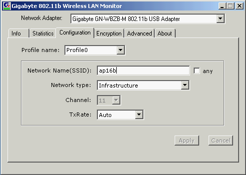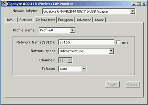 В разделе Configuration можно задать основные параметры сети (SSID, тип, скорость и номер канала). Причем возможно организовать несколько профилей для различных сетей, после чего вызывать нужный, в зависимости от конфигурации текущей беспроводной сети.