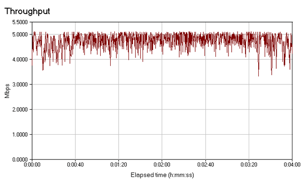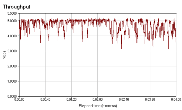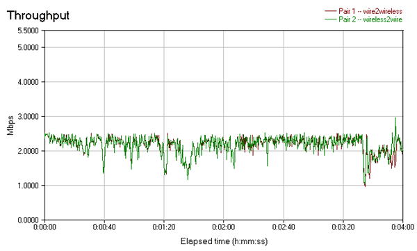 Поток данных довольно стабилен. Кратковременные провалы присутствуют лишь в полнодуплексном режиме, но что характерно, в нем сохраняется равномерное распределение трафика по прямому и обратному каналу (т.е. прямой и обратный канал примерно равны на протяжении всего теста).