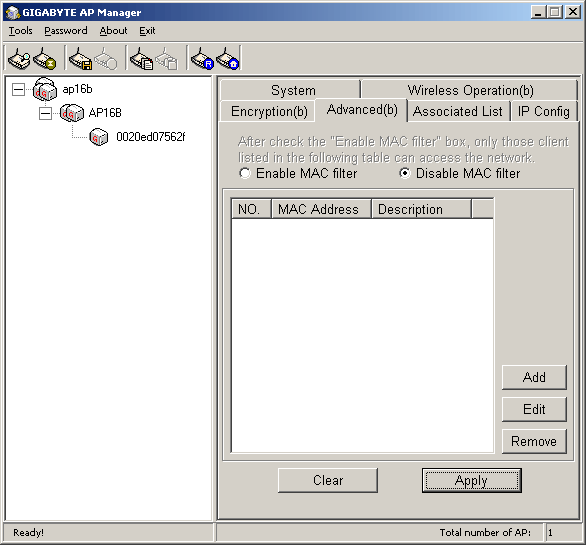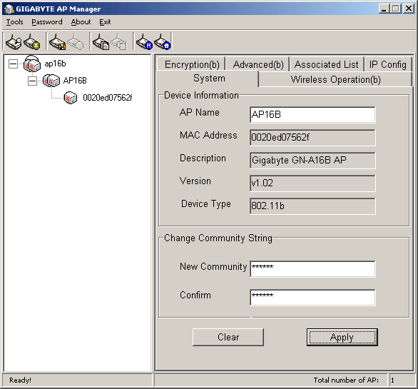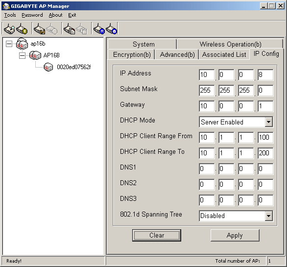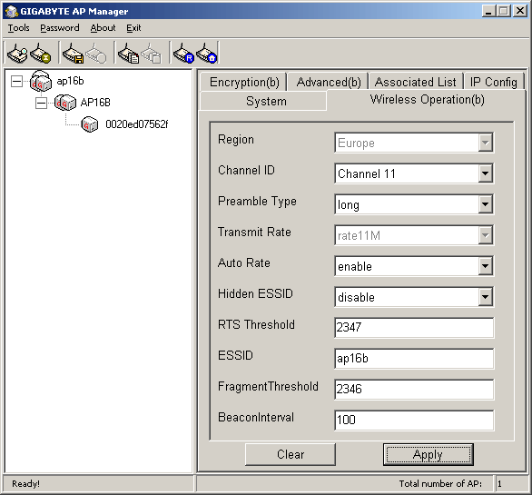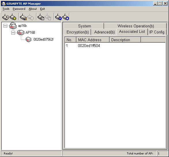 Настройка точки доступа через Gigabyte AP Manager и через WEB-интерфейс практически не отличаются. С одной стороны, программа удобнее тем, что позволяет найти все точки доступа в локальной сети (если их несколько) и представить их в виде списка-дерева в левой части программного интерфейса. С другой стороны, у нее есть свои недостатки, о которых ниже.