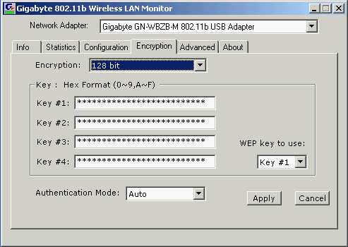 В следующей закладке доступны к настройке параметры WEP шифрования. Тут задается тип шифрования (64/128 WEP), четыре ключа и тип аутентификации. При вводе ключа сразу пишутся звездочки, что, возможно, и хорошо в плане безопасности, но очень неудобно для вводящего ключ (нельзя проверить введенные данные на ошибки).