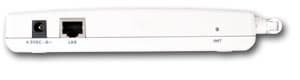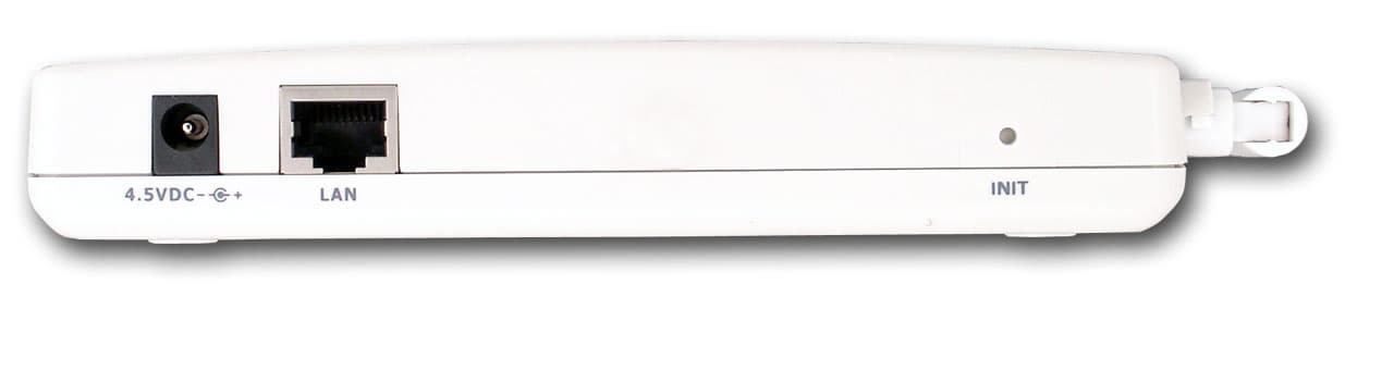 На задней панели расположены коннектор питания и разъем RJ-45 для подключения точки доступа к локальной сети. Кроме этого, в правой части (около антенны) расположена кнопка сброса настроек устройства в режим по умолчанию.