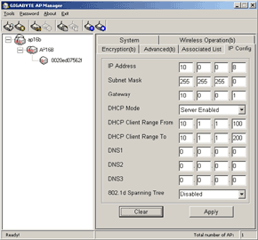 На закладке Associated List можно посмотреть MAC-адреса клиентов, работающих в данный момент с точкой доступа. А последняя закладка IP Config позволяет сконфигурировать IP-адресацию устройства. Кроме основных параметров, тут можно активировать встроенный DHCP сервер и задать диапазоны выдаваемых им адресов.