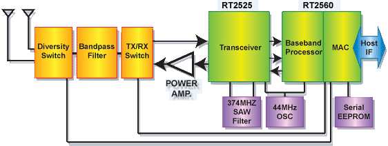 Чипсет состоит из трансивера RT2525 и микропроцессора RT2600, в последний интегрирован Cardbus/MiniPCI/PCI контроллер. Микропроцессор поддерживает WEP 64/128, TKIP, WPA, 802.11i методы шифрования и безопасности.