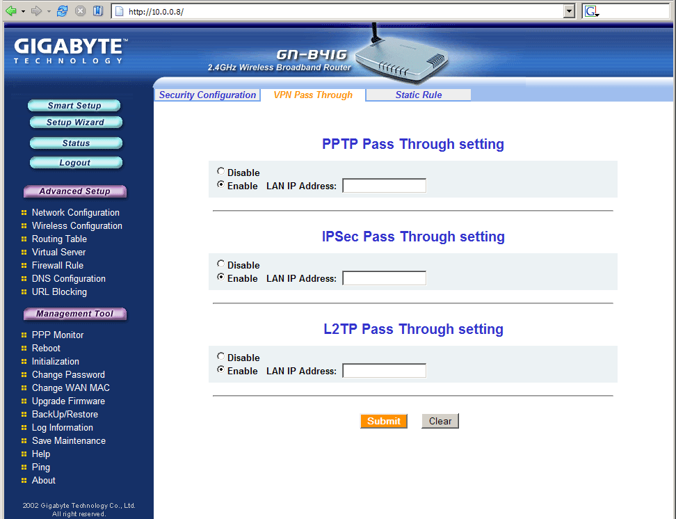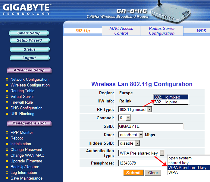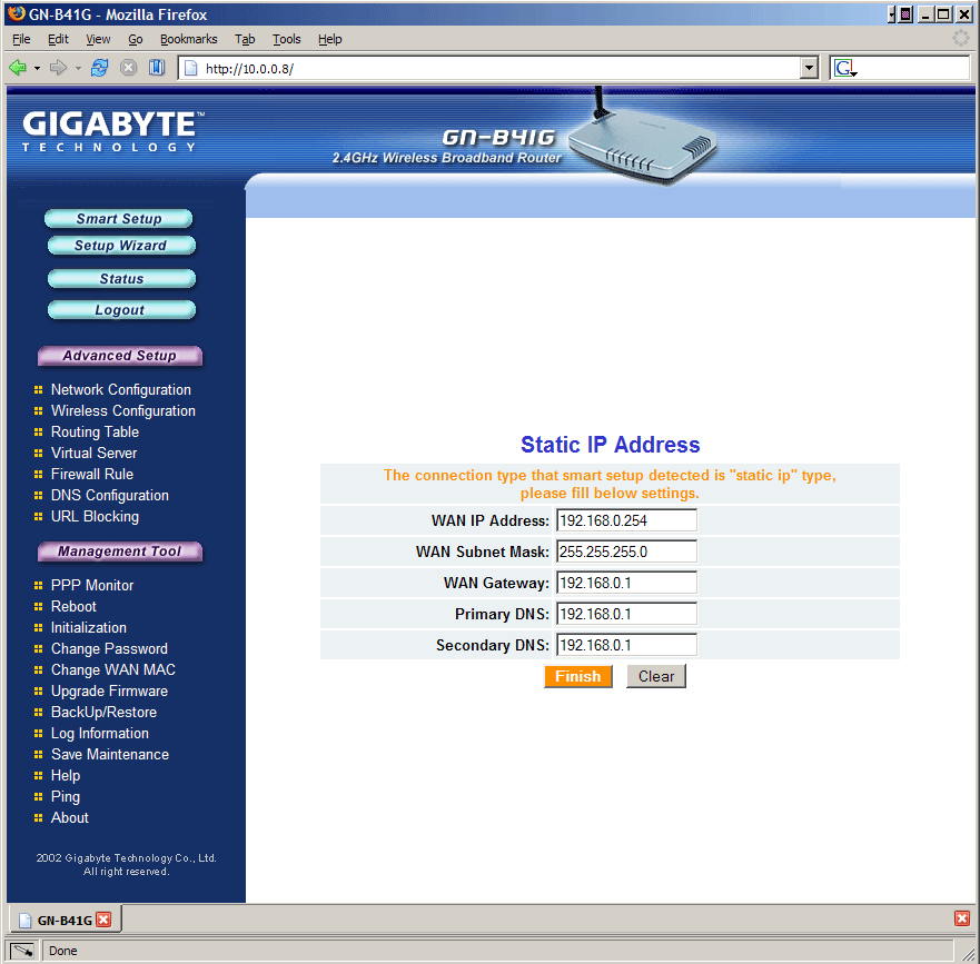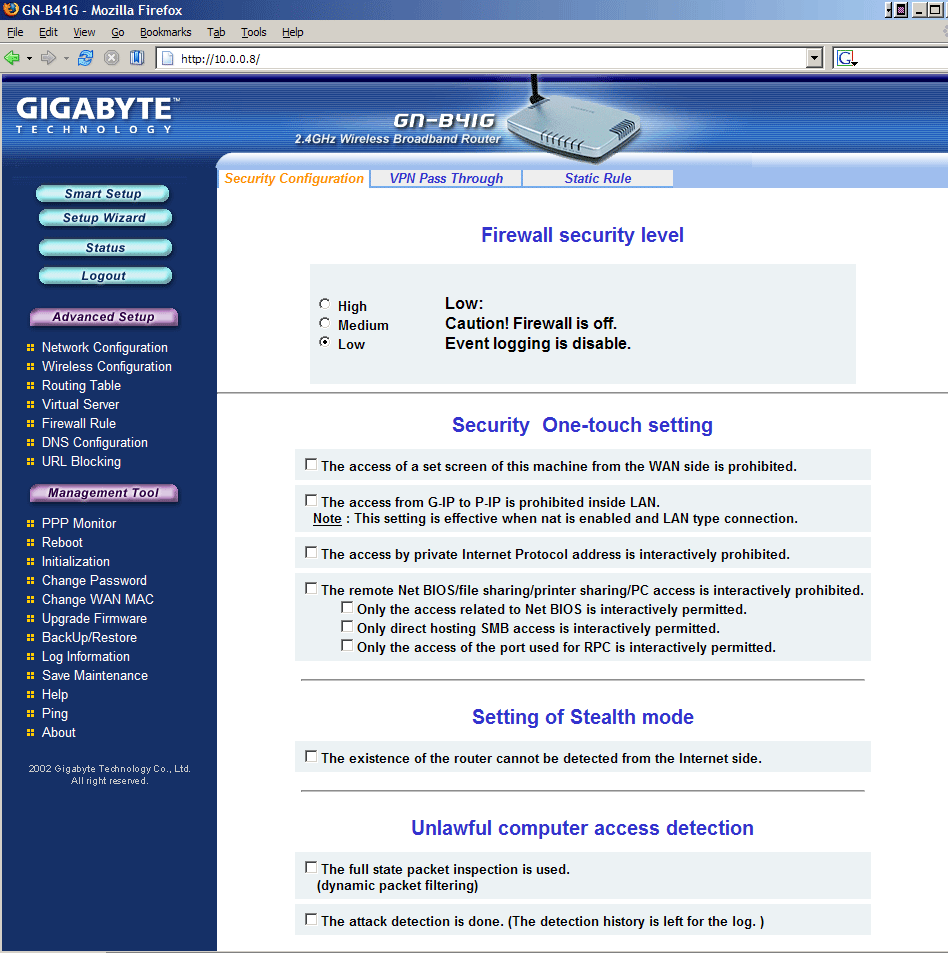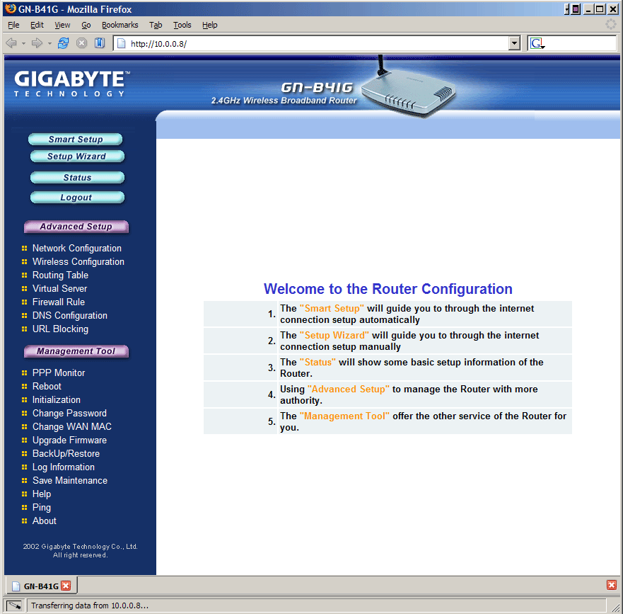 Примечательно то, что производитель для всех этих устройств заявляет поддержку функции "Smart Setup III". Если работу этой функции применительно к беспроводной карте мы уже рассматривали в предыдущем обзоре оборудования от Gigabyte, то Smart Setup на беспроводном маршрутизаторе мы еще не оценивали. Интересно будет посмотреть, насколько он хорош там — ведь настройка оборудования типа маршрутизатора гораздо сложнее (для неподготовленного пользователя), чем настройка беспроводной карты.