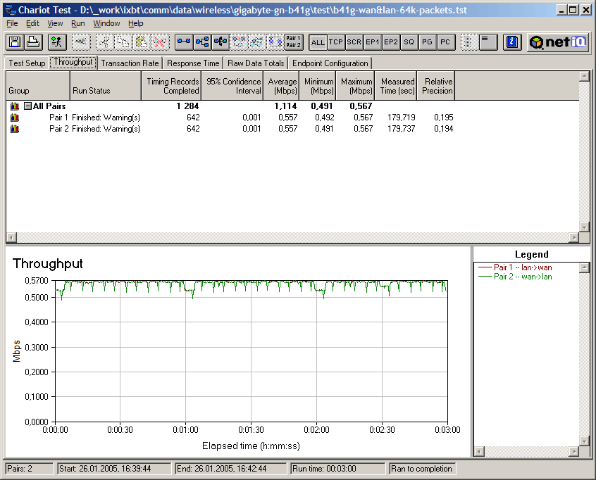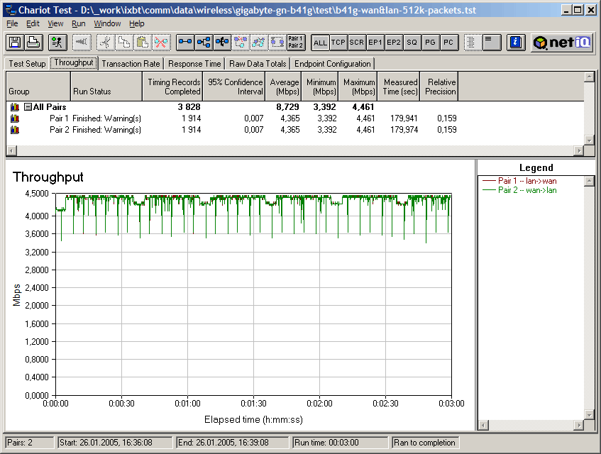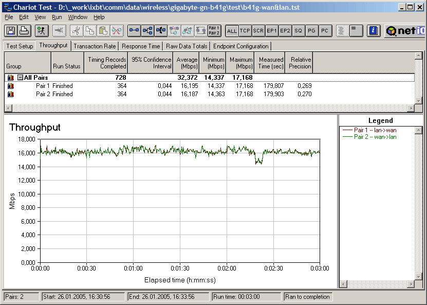 Производительность беспроводной части, режим Infrastructure, полный дуплекс, автоматический режим выставления скорости (54 Мбит). Как обычно, тестировались три режима работы: