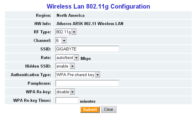 Далее идет раздел Wireless Configuration. Здесь настраивается все связанное с беспроводным сегментом. В первом подразделе, кроме стандартных, стоит отметить функцию 156-битного шифрования, правда она не является стандартной и следовательно, нет гарантии, что заработает в паре с другим устройством (тоже поддерживающим эту функцию) производства не Gigabyte.
