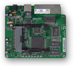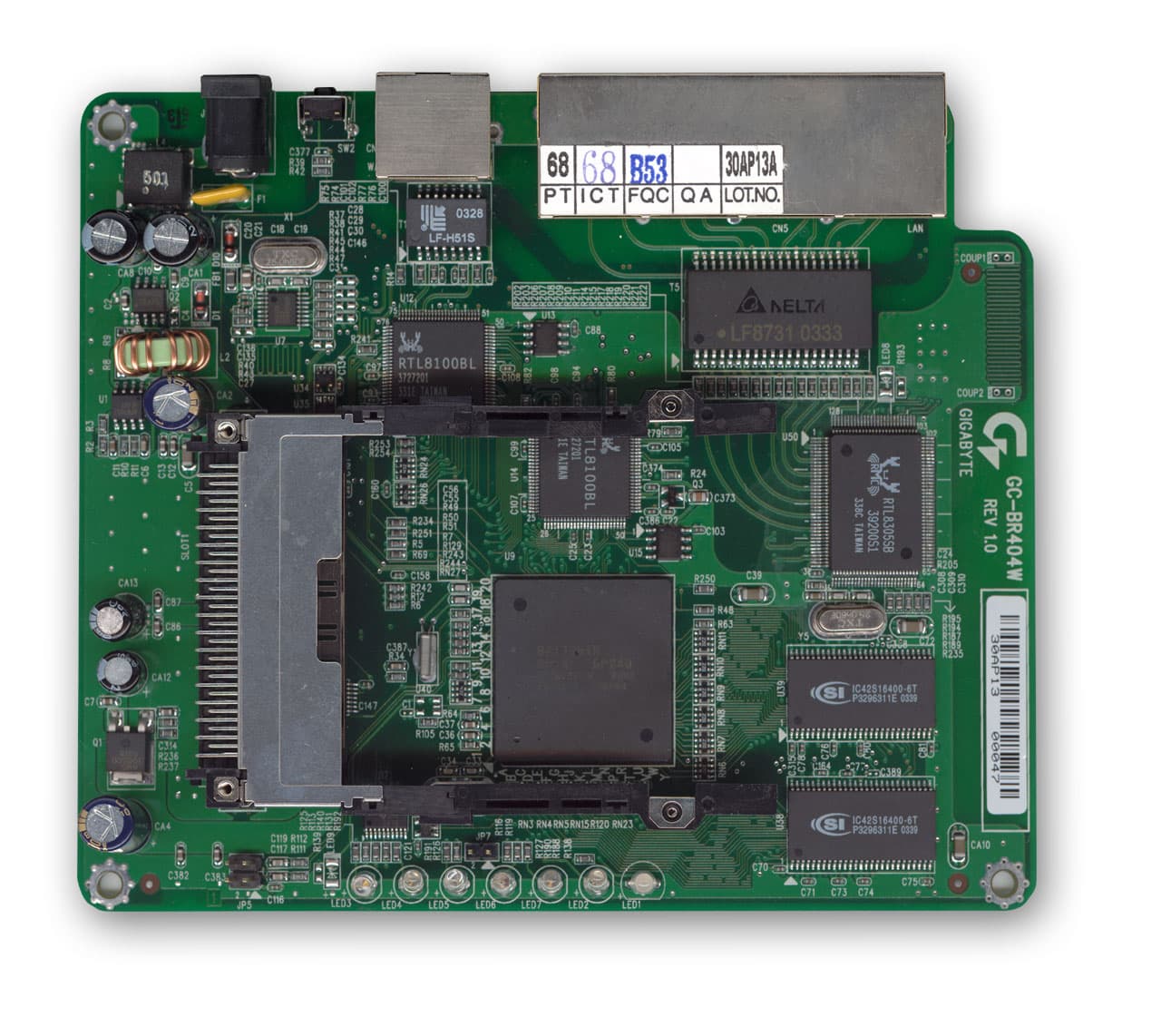 На плате установлены две микросхемы памяти неизвестного объема и максимальной частотой работы 166 МГц. Роль пятипортового 100Mbit коммутатора выполняет микросхема Realtek RTL8305SB. Для реализации Auto MDI-X используется чип LF8731, располагающийся ближе к LAN портам коммутатора. Далее располагаются две микросхемы Realtek RTL8100BL, являющиеся Fast Ethernet контроллерами. Один из них отвечает за WAN порт роутера, второй видимо идет к интерфейсу PCMCIA карты.