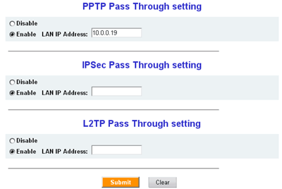 Следующий подраздел позволяет разрешить VPN pass-through для PPTP, L2TP и IPSec протоколов, к сожалению, возможно задание только одного IP для каждого из протоколов.