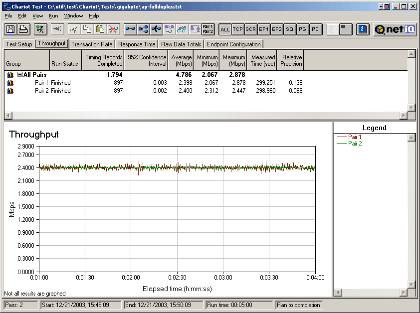 В данном случае было установлено два сенсора. Один находился на компьютере с установленным на нем объектом тестирования (GN-WLBZ201), другой на хосте, подключенном к локальному (проводному) порту точки доступа или с установленным беспроводным адаптером WL-130 (в зависимости от характера теста Infrastructure или Adhoc). В качестве шаблона генерации использовался шаблон Throughput с жестко заданным временем работы (300 секунд).