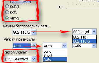 Использование режима Turbo, позволяющего производить подключение на скорости 72 Мбит/с вместо 54, судя по тестам, возможно только в режиме Infrastructure. Его использование в режиме AdHoc никак не отражалось ни на скорости подключения, ни на скорости трафика. Также возможен выбор региона или используемого для региона стандарта — от этого зависит сколько каналов беспроводной связи можно использовать.