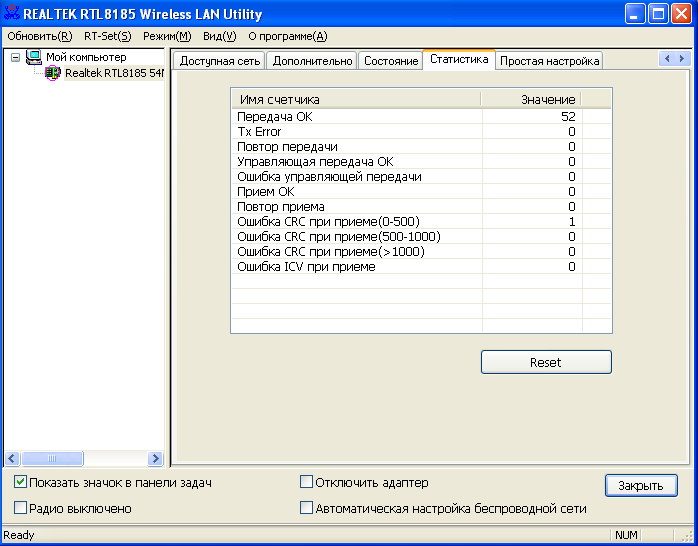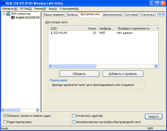 Используемые при тестировании данного беспроводного адаптера версии драйверов и утилиты были скачаны с сайта Realtek (здесь). Сразу скажу, что при использовании драйвера и утилиты настройки, идущих на диске в комплекте с устройством, мне не удалось использовать подключение в режиме AdHoc на скорости 54 Мбит/с (подключение производилось только на скорости 11 Мбит/с). Обновление только версии драйвера устройства также не исправило данную ситуацию (при использовании для настройки старой версии утилиты настройки), а помогло только комплексное обновление драйвера и утилиты.