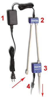 Первые три устройства одинаковы для всех комплектов серии POE-100 — из суммирующего устройства всегда выходит UTP — кабель, по которому идут данные и питание на 48 В, а уже из разделяющего устройства выходит провод с данными и провод питания устройства с нужным нам напряжением (в нашем случае это 9 В). Поэтому разделяющее устройство отличается в зависимости от напряжения питания устройства. Общая схема построения сети изображена на следующем рисунке (стрелочками указаны места входа и выхода Ethernet сигнала).