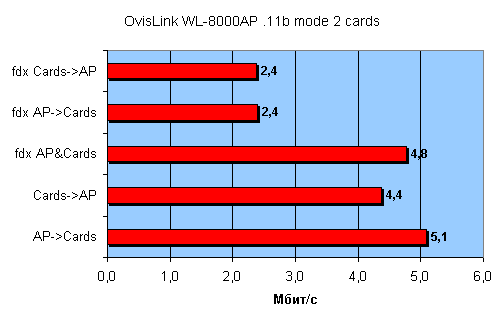 Тест LAN — WLAN режим Infrastructure — тест точки доступа: трафик гонялся между двумя компьютерами с двумя беспроводными адаптерами. Скорость соединения выставлялась в режим Auto mode. Тест производился с помощью Chariot NetIQ. Для теста использовались беспроводные адаптеры OvisLink WL-8000PCI и OvisLink WL-8000PCM. Расстояние между точками не превышало пяти метров.