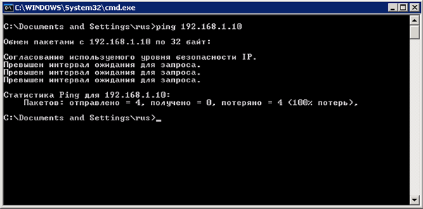 Компьютеры локального сегмента не пингуются, но при этом видно, что согласование политик происходит, о чем свидетельствует надпись "Согласование используемого уровня безопасности IP". Если надпись "Согласование используемого уровня безопасности IP" выводится только один раз &mdsah; значит, политика безопасности принята и туннель установлен; в случае если допущена ошибка (например, предварительные ключи не совпадают или заданы различные алгоритмы шифрования) — при каждой попытке пропинговать компьютер из локального сегмента будет производиться попытка установления VPN-соединения (то есть для данного случая надпись "Согласование используемого уровня безопасности IP" будет выведена 4 раза).