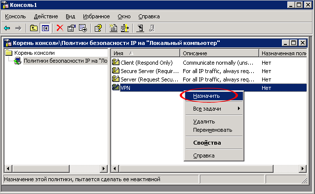 Политика безопасности "VPN" теперь полностью создана, и нам остается ее только включить. Для включения политики "VPN" щелкаем на ней в правом окне правок кнопкой мыши и выбираем пункт "Назначить":