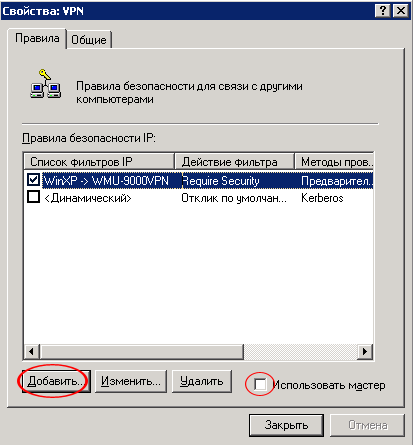 Выбираем оба созданных нами правила ("WinXP -> WMU-9000VPN" и "WMU-9000VPN -> WinXP") и жмем на кнопку "Закрыть":