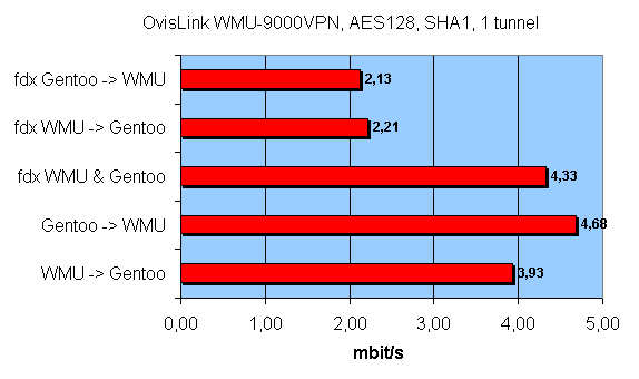 Алгоритм шифрования AES128 является более ресурсоемким, чем 3DES, но все тесты, приведенные выше, показали более высокую скорость передачи при использовании именно AES128 шифрования. Возможно, устройство имеет аппаратную поддержку AES128 шифрования. Тем не менее, судя по тестам, можно говорить, что скорость IPSEC VPN-соединений очень низкая.