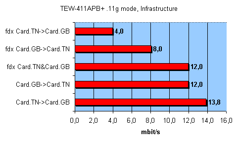 Тест WLAN-WLAN режим Infrastructure — трафик гонялся между двумя компьютерами с беспроводными сетевыми картами через точку доступа (режим Infrastructure). Скорость соединения устанавливалась в Auto mode. Тест проводился для двух режимов: 802.11b ; 802.11g. Для тестирования использовалась беспроводная сетевая карта TRENDnet TEW-401PCplus PCMCIA Card и Gigabyte 802.11g PCI WLAN Card. Тест производился с помощью Chariot NetIQ. Расстояние между точками не превышало пяти метров.