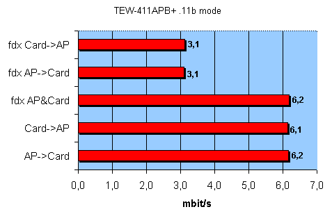 Точка доступа TEW-410APB+ в паре с сетевой картой TEW-401PCplus обладает высокой производительностью как при работе в .11b режиме, так и в 11g режиме, но странным образом снижают производительность сетевых карт других производителей при масштабировании. Возможности технологии AfterBurner окончательно еще не реализованы, может статься, с выпуском новой версии прошивки что-то изменится.