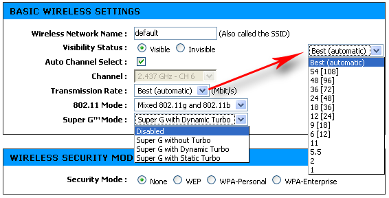 Настройки беспроводной связи позволяют выбрать скорость беспроводного соединения, а также задействовать режимы увеличения производительности Super G и Turbo.