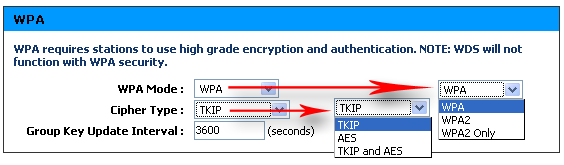 Настройки WPA-шифрования позволяют использовать алгоритмы AES и TKIP.